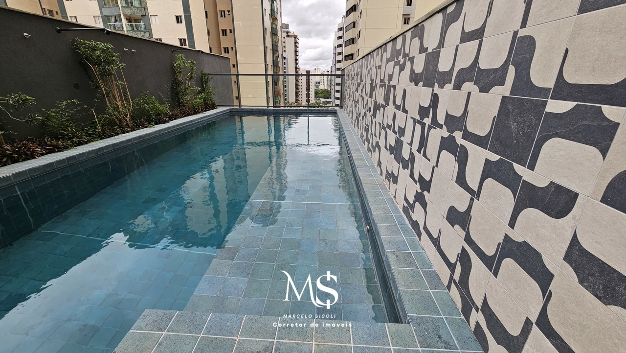Tem 118m2 de área útil. Apartamento de terceiro andar. Ampla sala integrada com a cozinha e área de serviço. Varanda gourmet com vista para a Avenida Flamboyant. Tem espaço para um grande closet, um banheiro completo, duas semi-suites e um quarto além de uma suíte. Totalizando 4 quartos e três banheiros portanto.