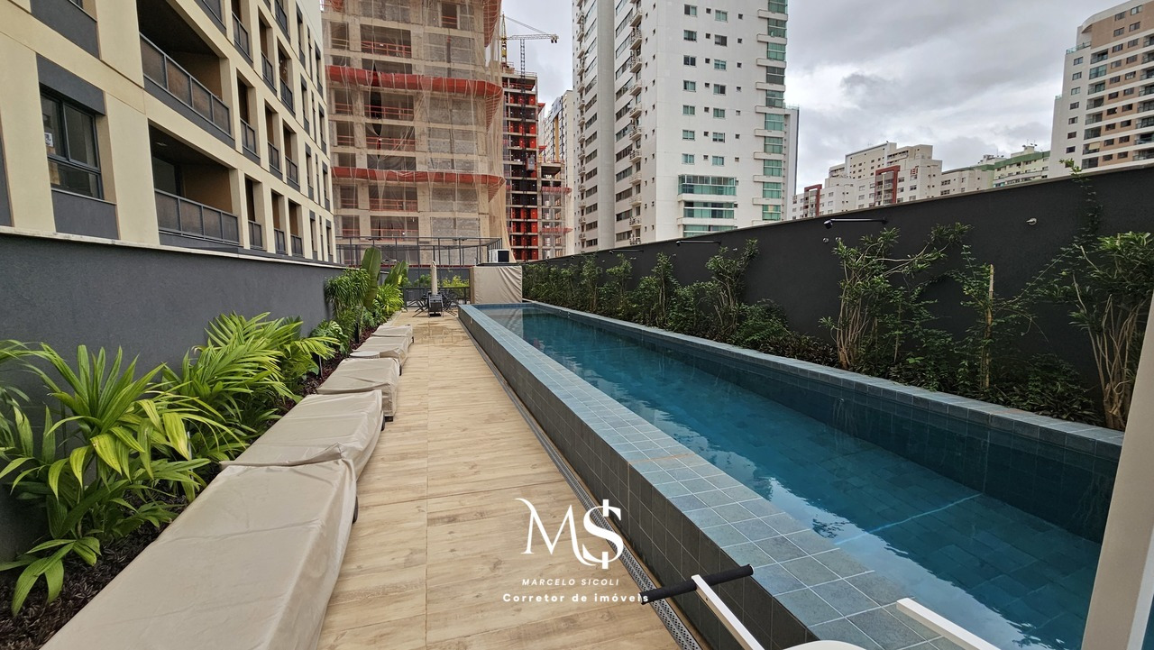 Tem 118m2 de área útil. Apartamento de terceiro andar. Ampla sala integrada com a cozinha e área de serviço. Varanda gourmet com vista para a Avenida Flamboyant. Tem espaço para um grande closet, um banheiro completo, duas semi-suites e um quarto além de uma suíte. Totalizando 4 quartos e três banheiros portanto.