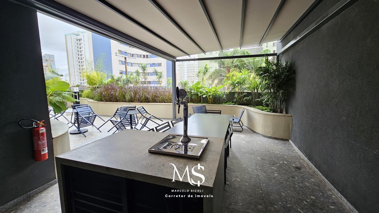 Tem 118m2 de área útil. Apartamento de terceiro andar. Ampla sala integrada com a cozinha e área de serviço. Varanda gourmet com vista para a Avenida Flamboyant. Tem espaço para um grande closet, um banheiro completo, duas semi-suites e um quarto além de uma suíte. Totalizando 4 quartos e três banheiros portanto.