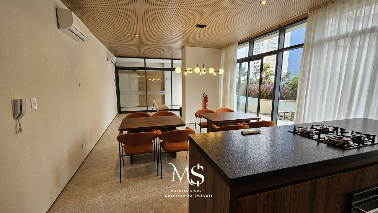Tem 118m2 de área útil. Apartamento de terceiro andar. Ampla sala integrada com a cozinha e área de serviço. Varanda gourmet com vista para a Avenida Flamboyant. Tem espaço para um grande closet, um banheiro completo, duas semi-suites e um quarto além de uma suíte. Totalizando 4 quartos e três banheiros portanto.