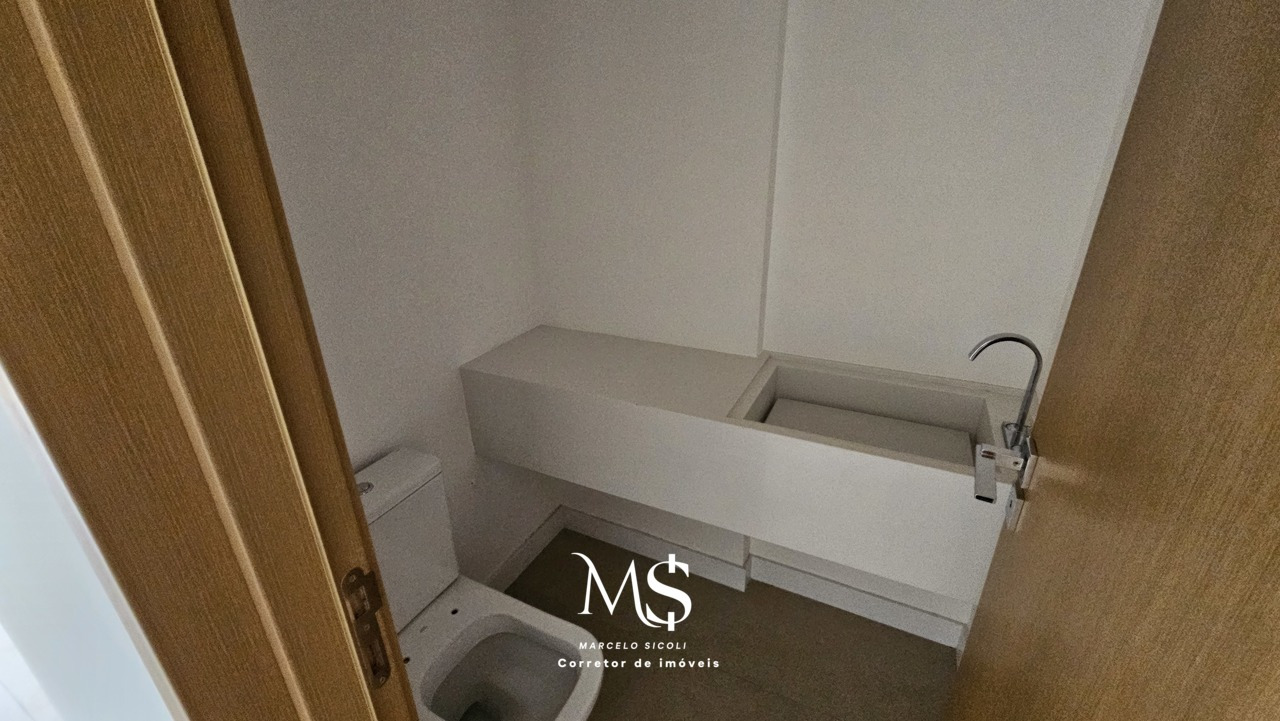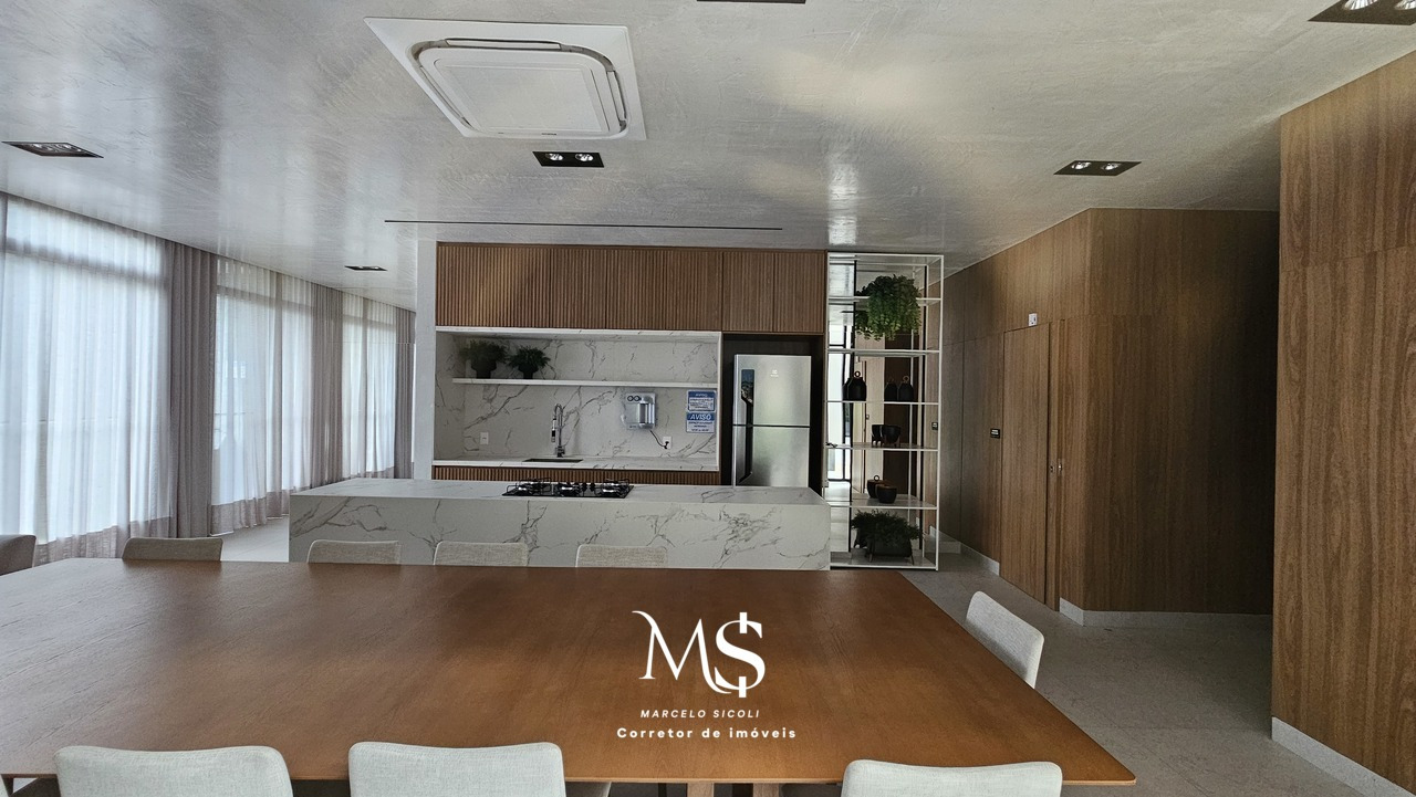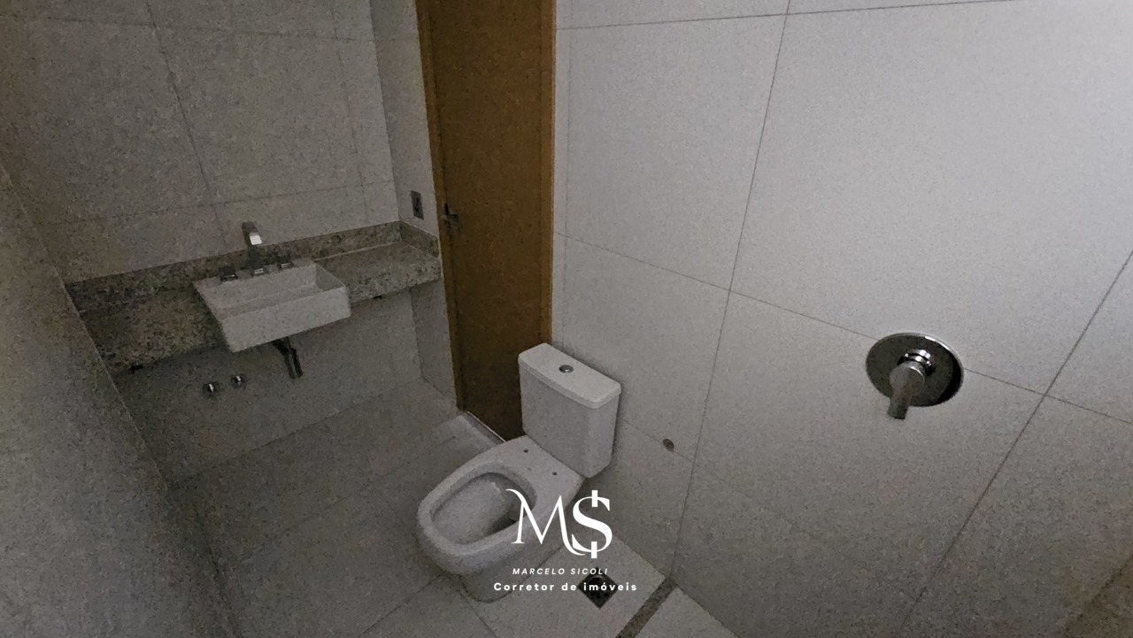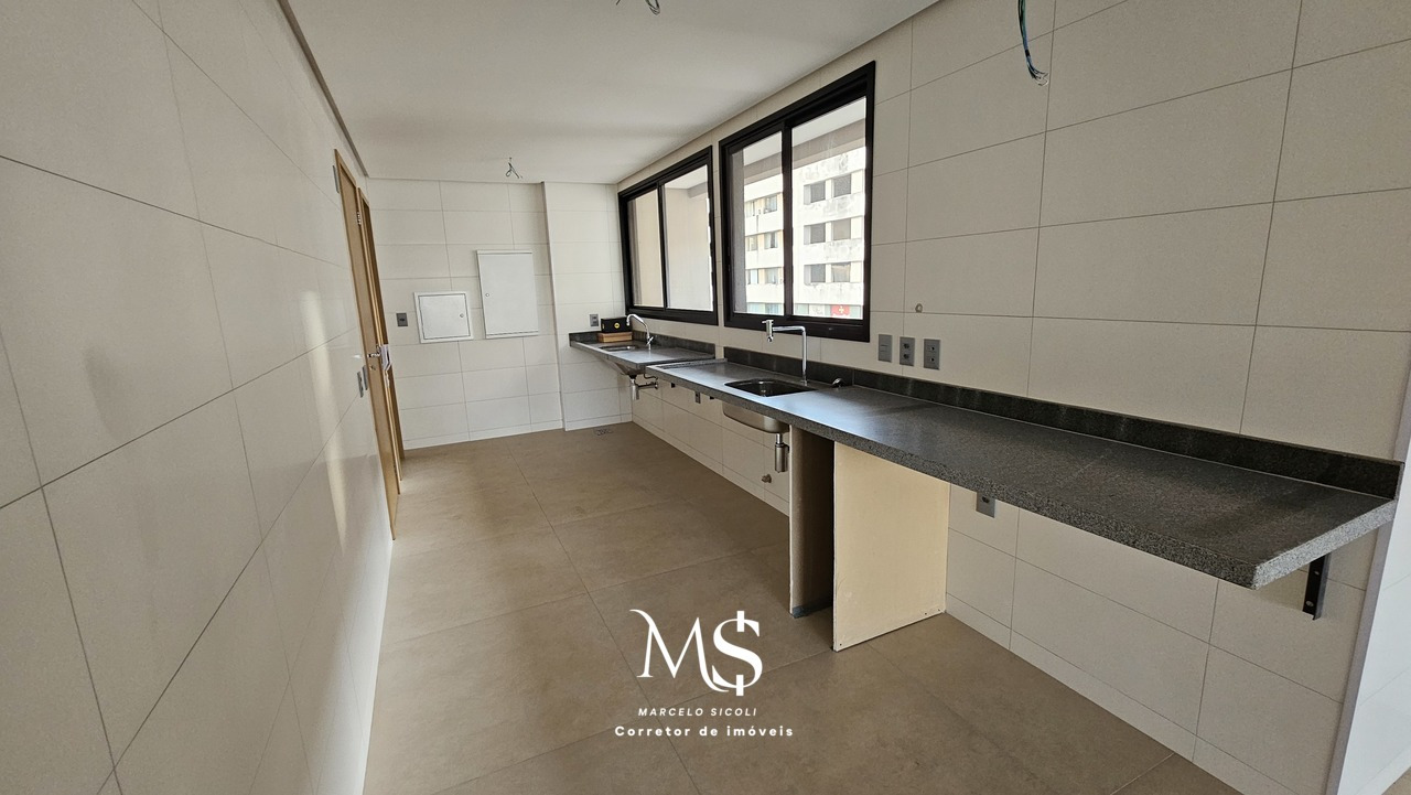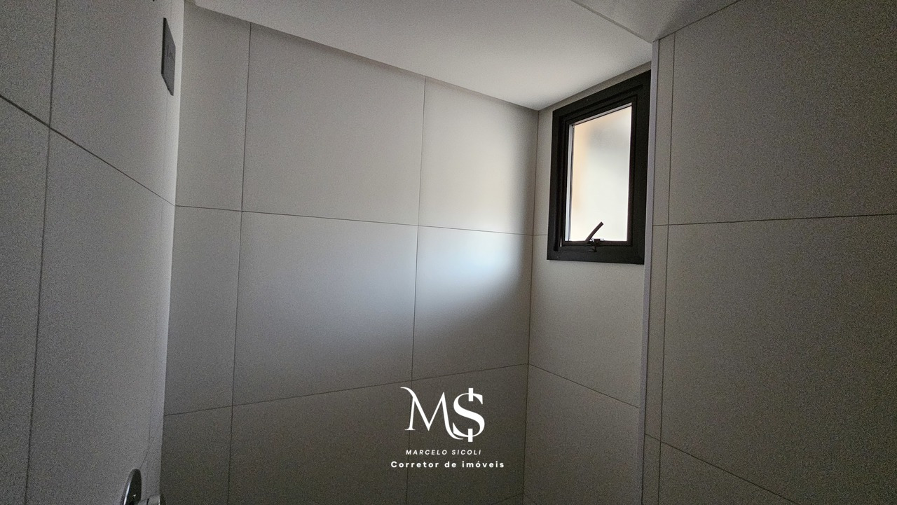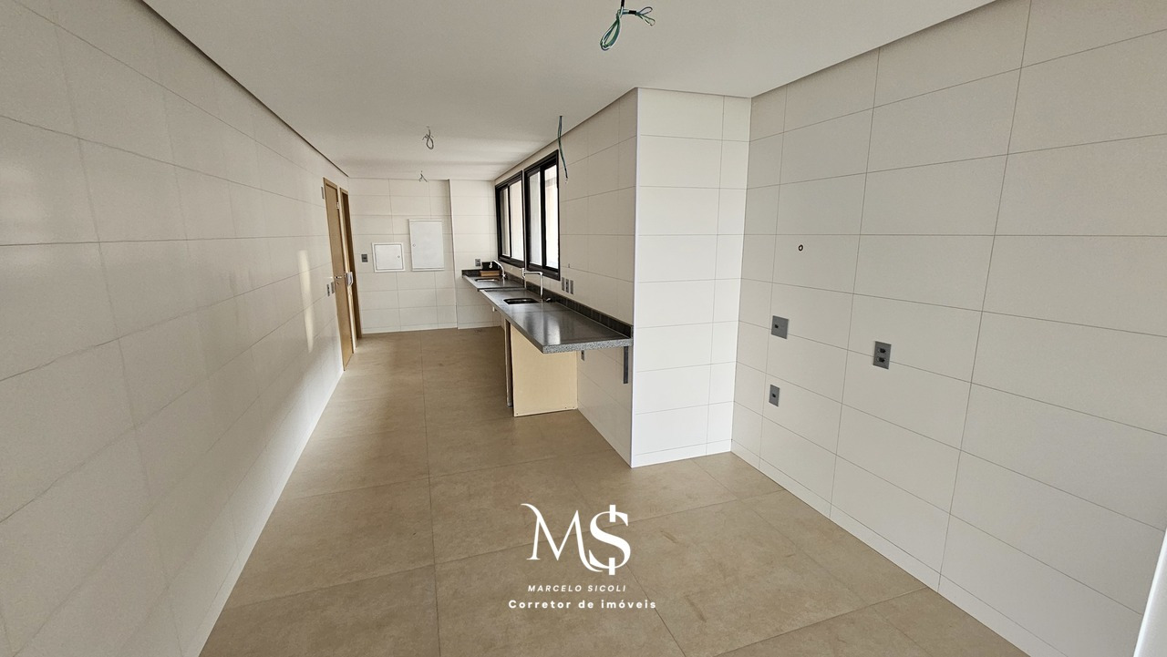 Tem ampla cozinha integrada com a sala e também um banheiro de serviço. Tem duas entradas independentes (social e de serviço). São 3 suítes.